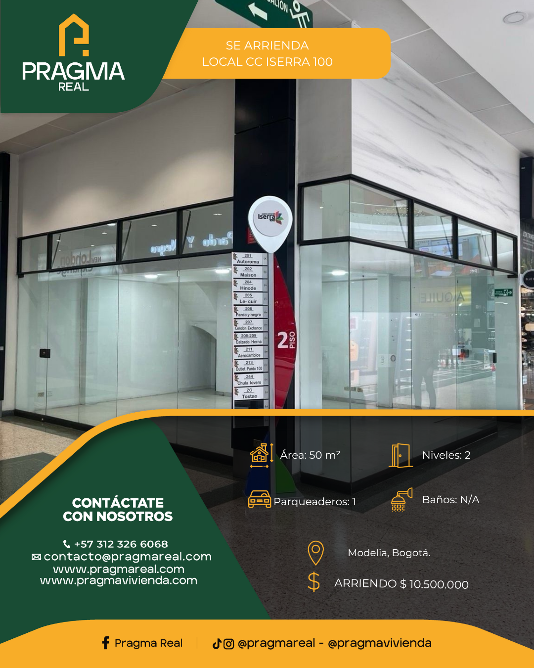 SE ARRIENDA, excelente LOCAL en el Centro Comercial ISERRA 100, el cual se encuentra localizado entre las Av. Suba y Calle 100 al noroccidente de la ciudad de Bogotá. Zona de alto desarrollo comercial y empresarial. El centro comercial, cuenta con importante zona bancaria, plazoleta de comidas, salas de cine, casinos, notaría, supermercados mas zona de oficinas entre otros. Este local se encuentra excelentemente ubicado en el 2do piso del centro comercial, en cercanía a los ascensores, lo cual le provee gran visibilidad y flujo de personas. Tiene un área total de 50 mts2, 35 mts2 en primer nivel y 20 de mezzanine. Pisos laminados de alto tráfico. Esquinero lo cual le otorga doble vitrina. Se beneficia de todas las amenidades del Centro Comercial, parqueadero para visitantes y compradores, baños publicos, seguridad 24/7, publicidad comercial, etc.